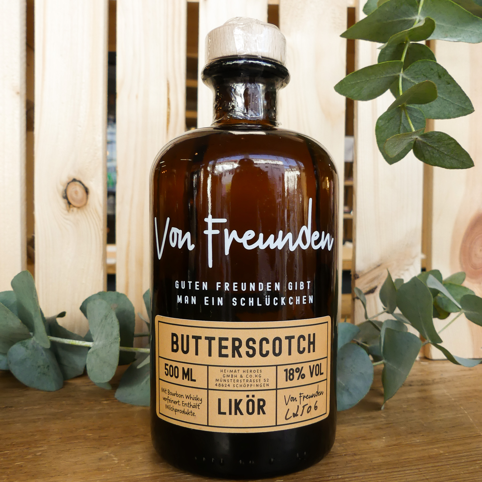 Cremiger Butterscotch Likör mit Bourbon Whisky. 18 % Vol. Weich, karamellig und angenehm süß.